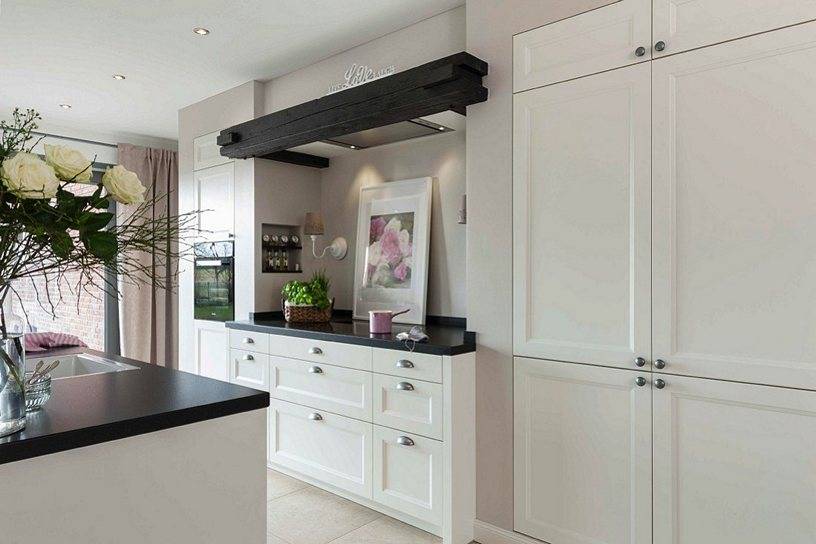 На строительном рынке есть масса материалов, которые пригодятся в борьбе с угловыми конструкциями. Используя плинтус и галтель, можно превратить выступающую шахту в красивую колонну, оригинально дополняющую интерьер. В подобном случае шахту над вытяжкой можно также оформить в едином стиле, что создаст единородную концепцию.