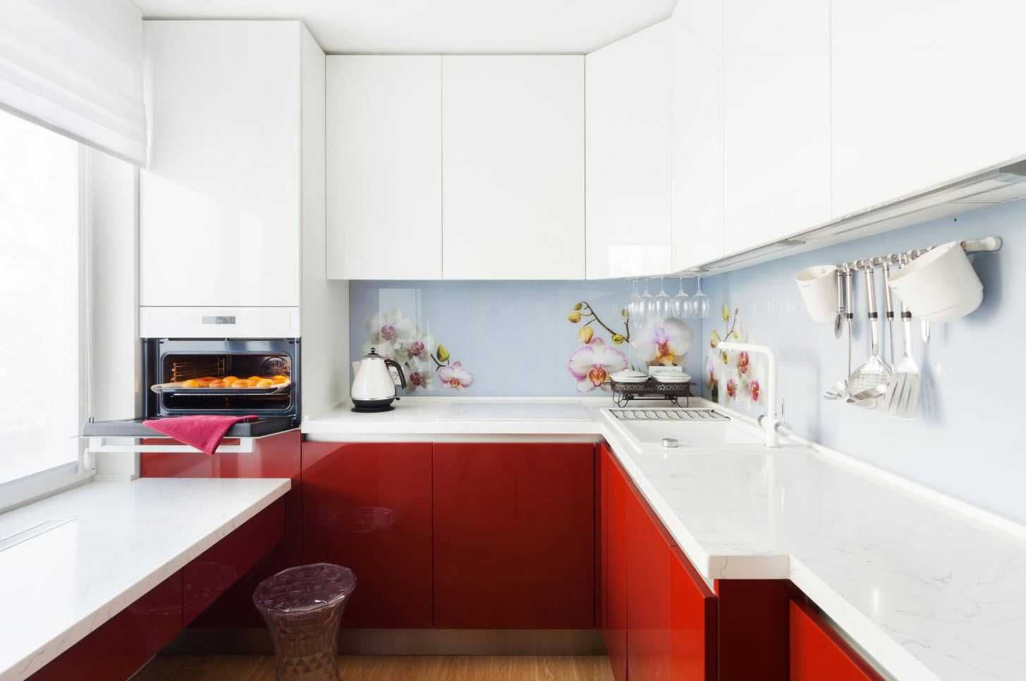 Мебель со светлыми фасадами лучше всего работает на небольшой кухне. Стилизованные интерьеры могут иметь деревянные шкафы с остеклением и современные гарнитуры в минималистском стиле, желательно с глянцевой поверхностью, отражающей свет. Если ваша кухня очень узкая, разместите шкафы на одной стороне комнаты. Если помещение имеет форму квадрата или прямоугольника, то остановитесь на мебели в букве «L». Помните, что для свободного перемещения по комнате между стеной и мебелью должно быть не менее 120 см. Дизайнеры тщательно заботятся о том, чтобы сделать гарнитуры, предназначенные для кухня 7 кв. м, максимально практичными.