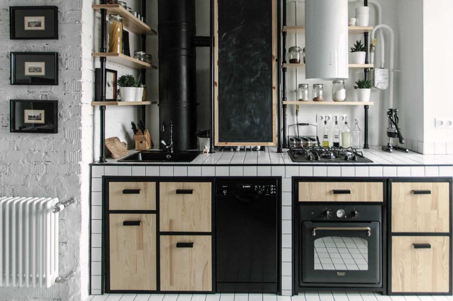 Оригинальная кухня в стиле «лофт» с окрытыми навесными шкафами