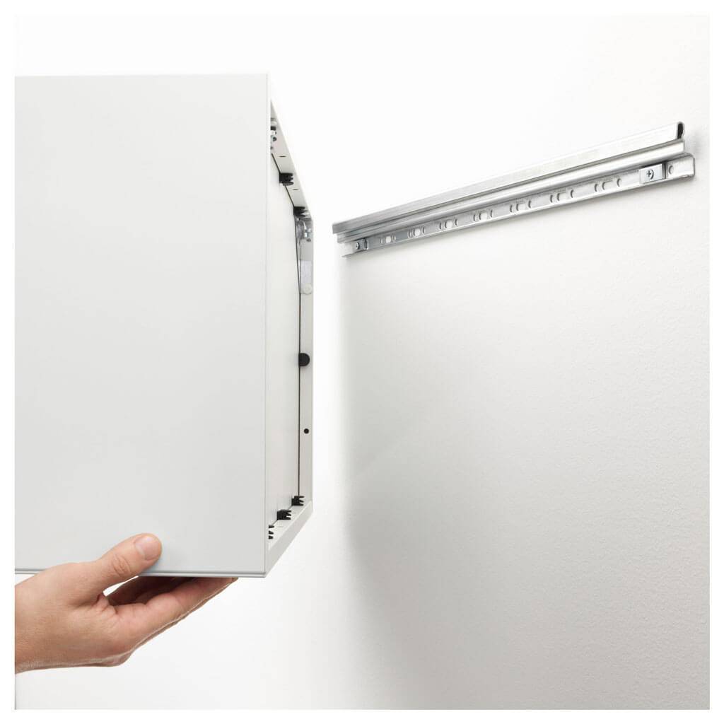 Шкафы можно вешать не только на петли. Более надежным вариантом считается установка на металлическую шину, когда крепления присоединяются к самой коробке, а затем цепляются на стену к закрепленному профилю (см. фото)