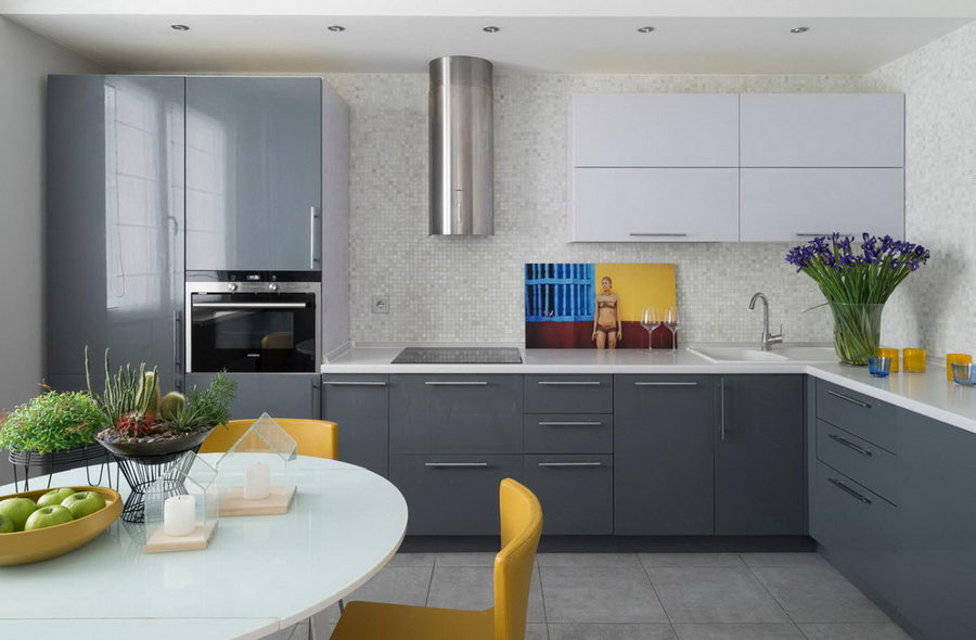 В кухне большой по площади неплохо будут смотреться те же глянцевые шкафы, но уже в темном цвете, вплоть до черного. Или, наоборот, ярком: красном, оранжевом, желтом. А вот оливковый, насыщенный серый выглядят очень благородно.