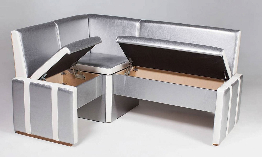 Сейчас в большинстве случаев кухонная мебель снабжена внутренними ящиками и нишами Но в случае если, таковые отсутствуют, можно отдельно приобрести плоские корзины. Они предназначены для использования пространства под диваном. Для большего удобства прямые диваны оснащаются специальными боковыми подъемными механизмами. Это позволяет добраться до любого места внутри дивана, не отодвигая обеденного стола.