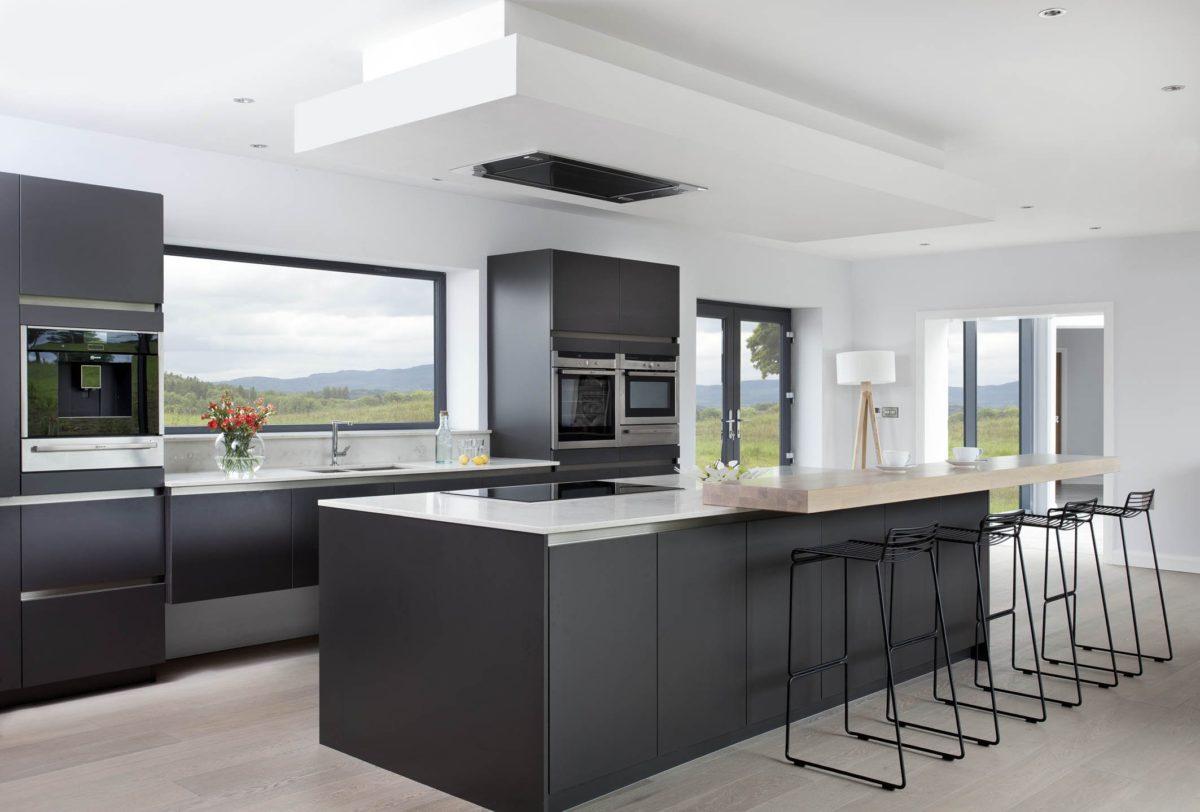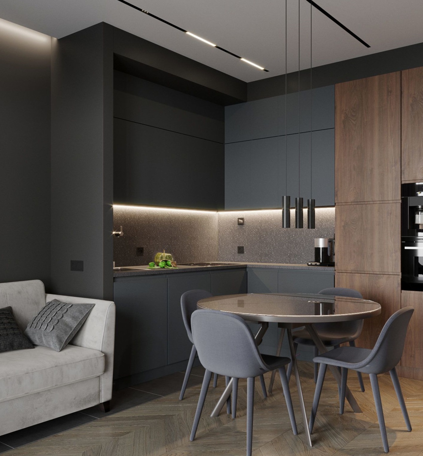 Тёмно-серая кухня с матовой поверхностью прекрасно впишется в интерьер кухни-столовой или кухни-гостиной.