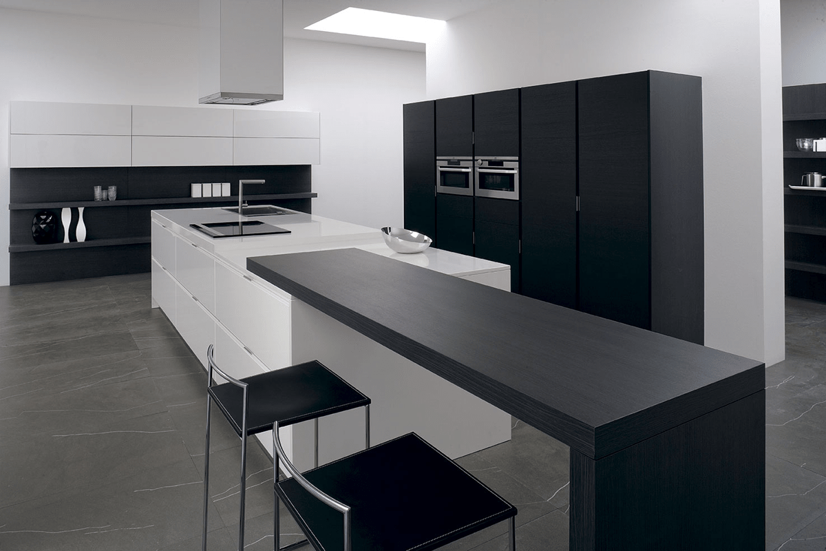 На кухне в стиле модерн нет ничего лишнего. В ней много воздуха и пространства. Чёрный рекомендуется использовать снизу (пол, стол и стулья, нижние фасады). Верхнюю часть интерьера отдают под светлые тона.