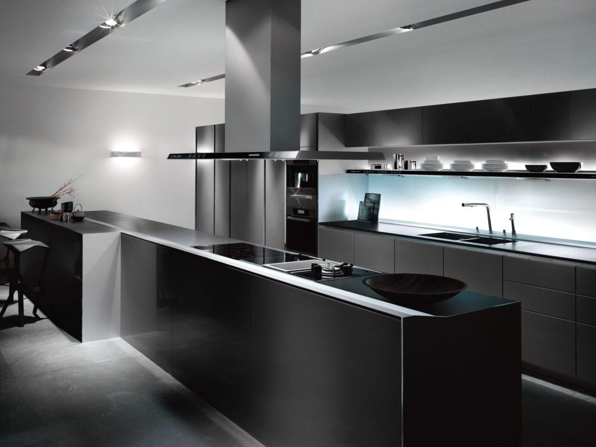 - Строгие геометричные формы в мебели и гарнитуре. Как правило, отсутствие ручек на дверцах и их замена на нажимной механизм.