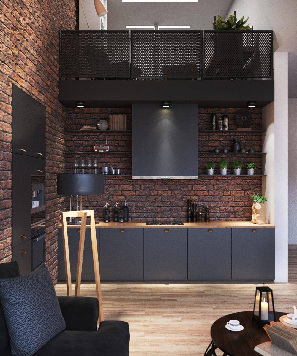 В чёрной кухне лофт в качестве акцента можно использовать кирпичную кладку на одной из стен. Или заменить ей фартук.