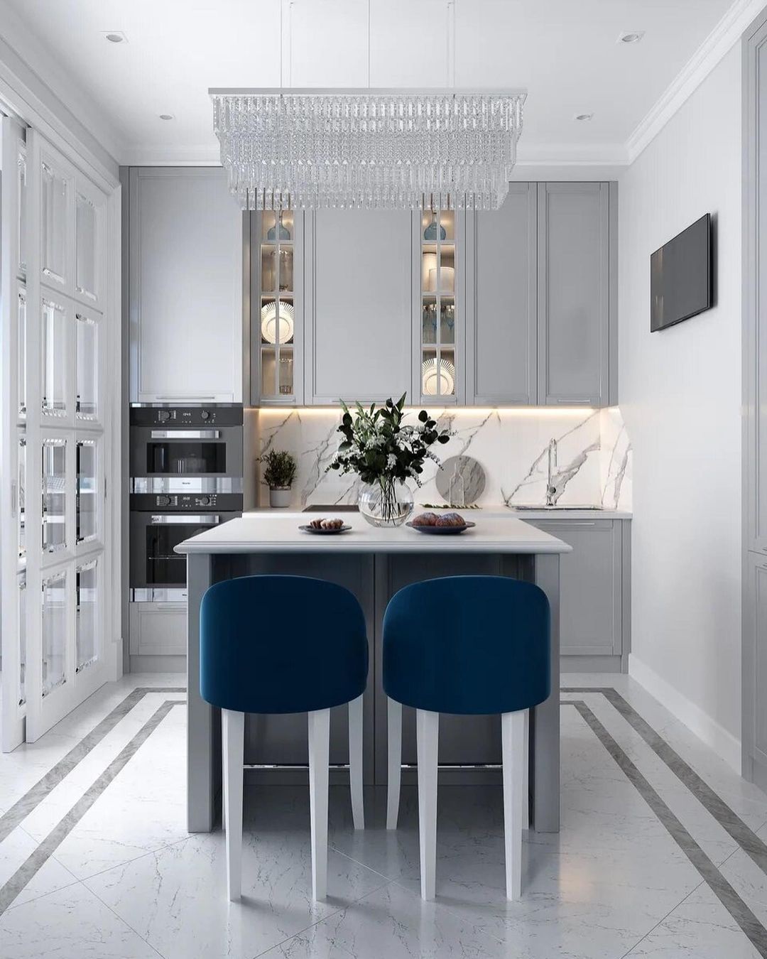 Мягкие линии в мебели и строгие формы в декоре — основа стиля. Чёрно-белая или коричневая кухня в арт-деко смотрится лучше всего. Добавить изящества можно с помощью классической люстры и неброского орнамента на фартуке.