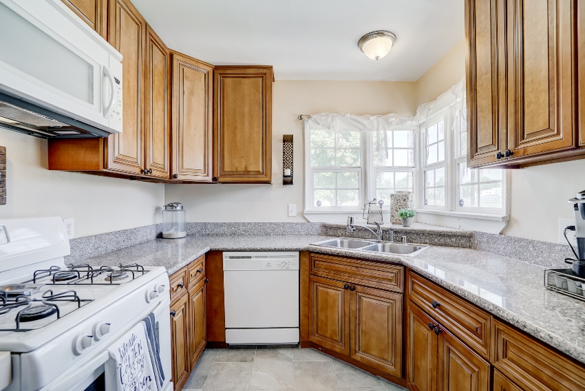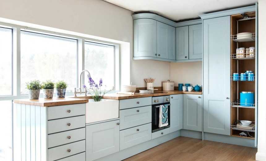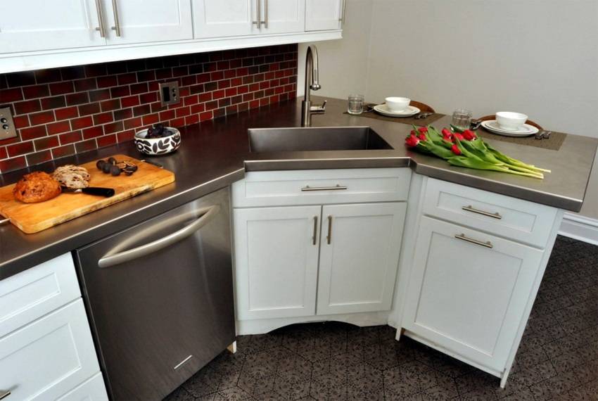 Самая распространенная планировка кухни — угловая. Размещение раковины в углу кухни в данном случае означает функциональное использование пространства. В качестве шкафчика под мойку используйте пятиугольную (скошенную) модель — подходить к воде будет удобнее.