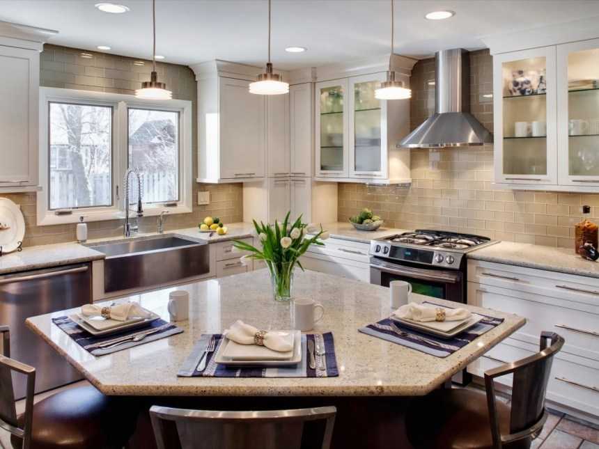 Оригинальный и практичный вариант для больших кухонь. Дополнительное место для работы с продуктами обеспечивает комфортное размещение даже помощников по кухне при приготовлении пищи. Такой вариант обстановки подходит для крупных помещений или кухонь, совмещённых с гостиной.