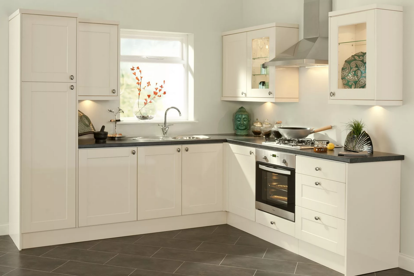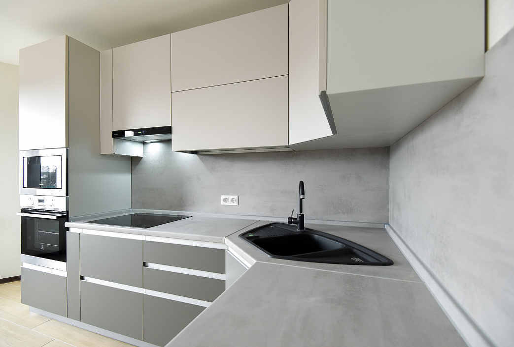 В Г-образной кухне приставной угловой сегмент бывает двух типов: в виде буквы «г» и трапециевидный, сложной конфигурации. Нижний угловой Г-образный модуль несколько ограничивает доступ к вмонтированной мойке, т. к. там образуется узкое пространство. В случае, когда планируется разместить мойку в углу, правильнее будет сместить ее в сторону, а не устанавливать по центру.