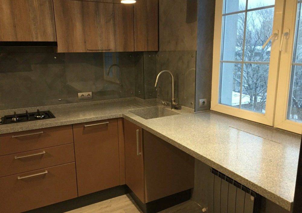 Самым практичным вариантом является натуральный камень. Он способен выдерживать постоянное воздействие влажной среды и абсолютно устойчив к механическим повреждениям. Недостатком такой столешницы является ее высокая стоимость. Также стоит отметить, что каменная столешница имеет большой вес и для ее установки конструкция гарнитура должна обладать высокой прочностью.