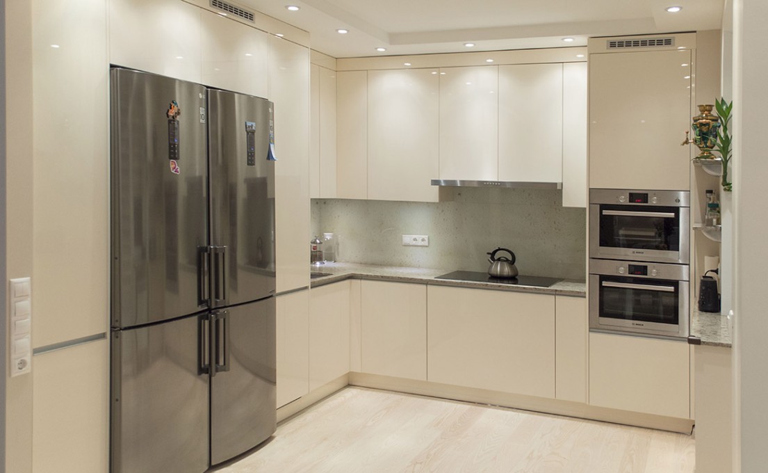 Еще одним вариантом использования угла может быть установка там секции с холодильником. Однако в нашей стране такой вариант дизайна угловой кухни — большая редкость, поэтому у большинства наших соотечественников он вызывает удивление. Более распространена схема использования угла, когда в этом месте устанавливают варочную панель с вытяжкой.