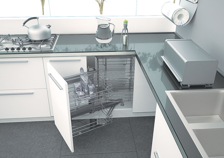 Чтобы большое пространство использовалось максимально эффективно, продумайте и сразу закажите подходящую фурнитуру. Наиболее частый вариант — карусели. С их помощью вам не нужно будет залезать внутрь ящика, чтобы достать предметы, которые хранятся у стенки — достаточно покрутить полку. Хранить здесь можно как моющие, так и бытовую технику или крупную посуду.