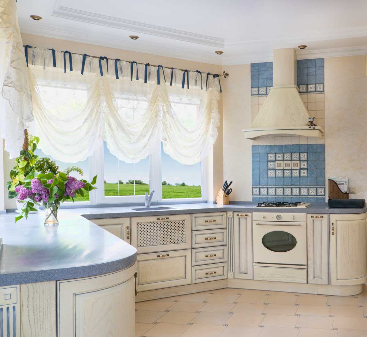 Для окон кухни в «деревенском» стиле очень хорошо подойдут шторы-кафе, так как они смогут защитить стекла от брызг, немного затенят помещение, но при этом оставят окно открытым. Ниже в фото-слайдере представлен интерьер П-образной кухни с окном, оформленным шторами-кафе в стиле кантри.