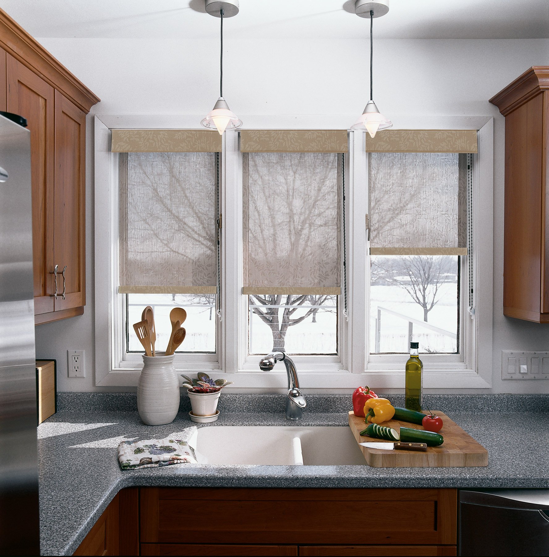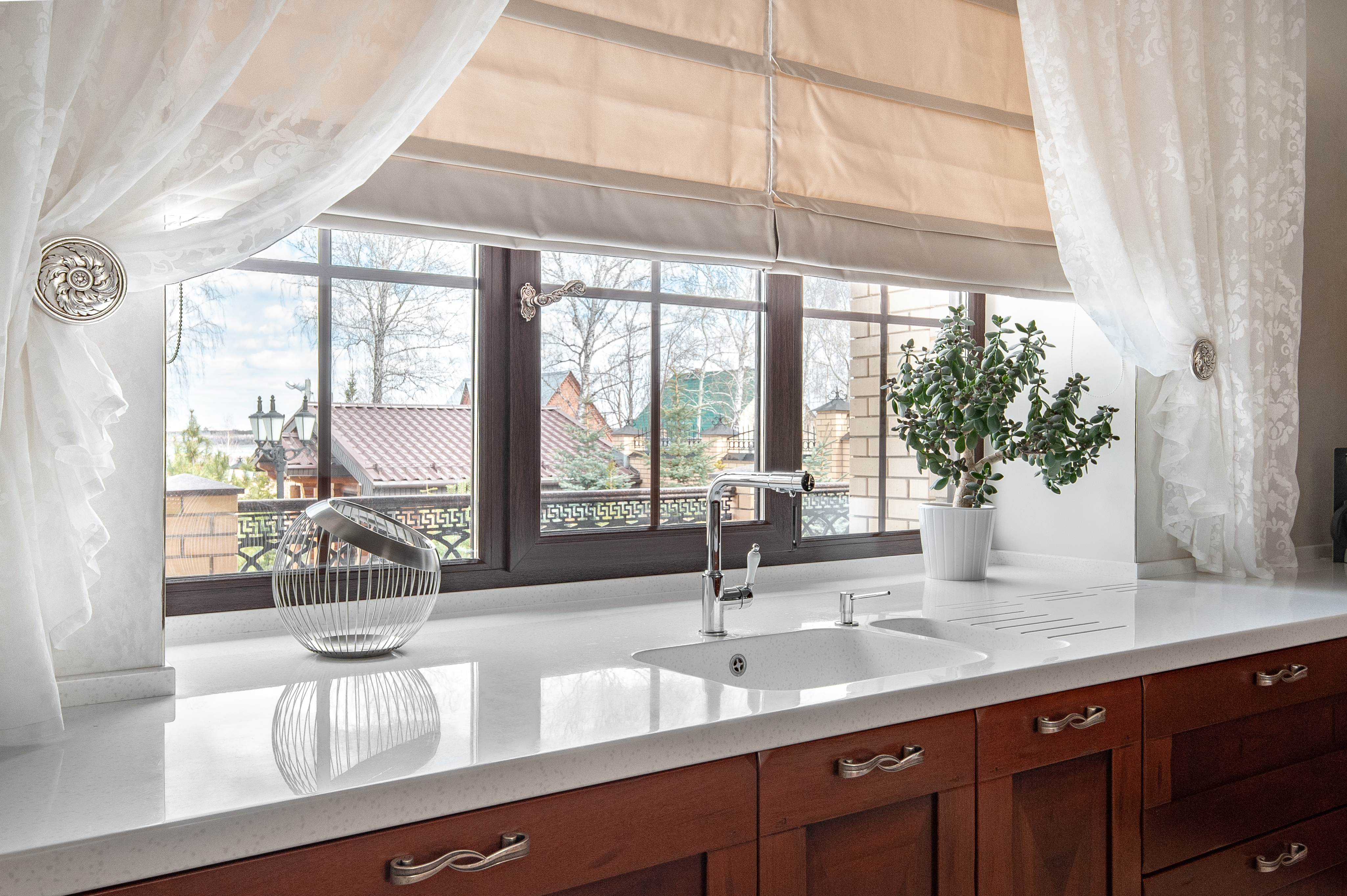 Занавески на окна с мойкой удобнее повесить те, что имеют механизм подъёма, т.е. римские или рулонные шторы либо жалюзи. Так вы сможете удобно закрывать и открывать обзор.
