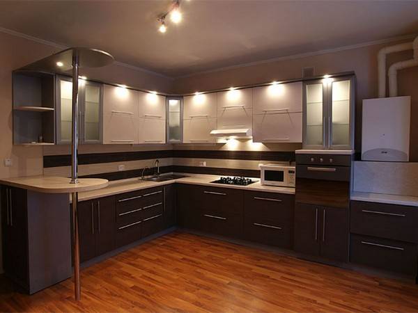 В условиях маленькой угловой кухни можно использовать ещё один фокус – светильники, встроенные прямо в гарнитур. Такие лампы хорошо подсвечивают рабочую зону, а обилие света само по себе делает пространство визуально просторнее.