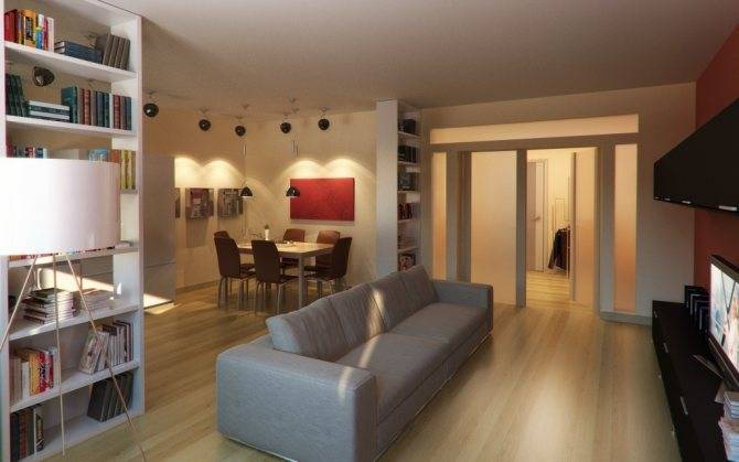 Проход между дверьми практически не создаст трудностей при обдумывании дизайна, в таком случае возможно применение и стандартных решений обычной гостиной, адаптированных под такое помещение. К стене с дверью можно прислонить шкаф-купе или стеллажи, а противоположный угол комнаты сделать мягким уголком, расставив диван, кресла или пуфики с небольшим столиком.