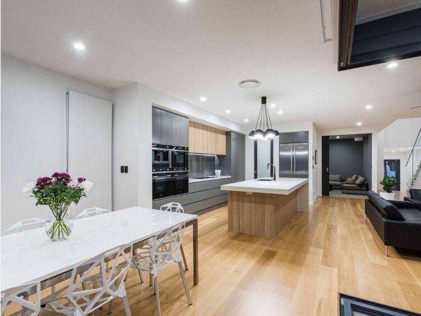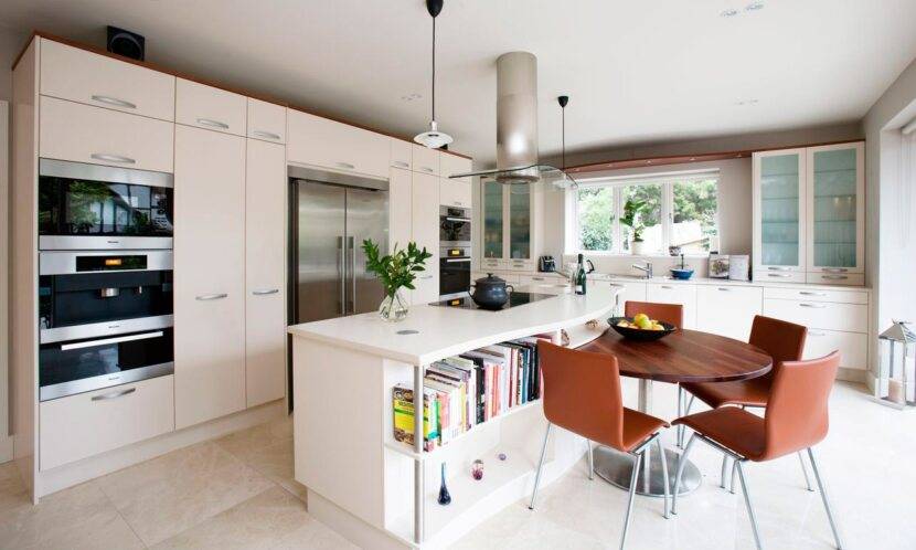 Правильная современная светлая кухня с солидным пространством потребует хорошо распланированных разграничений рабочей зоны и местом для приема пищи