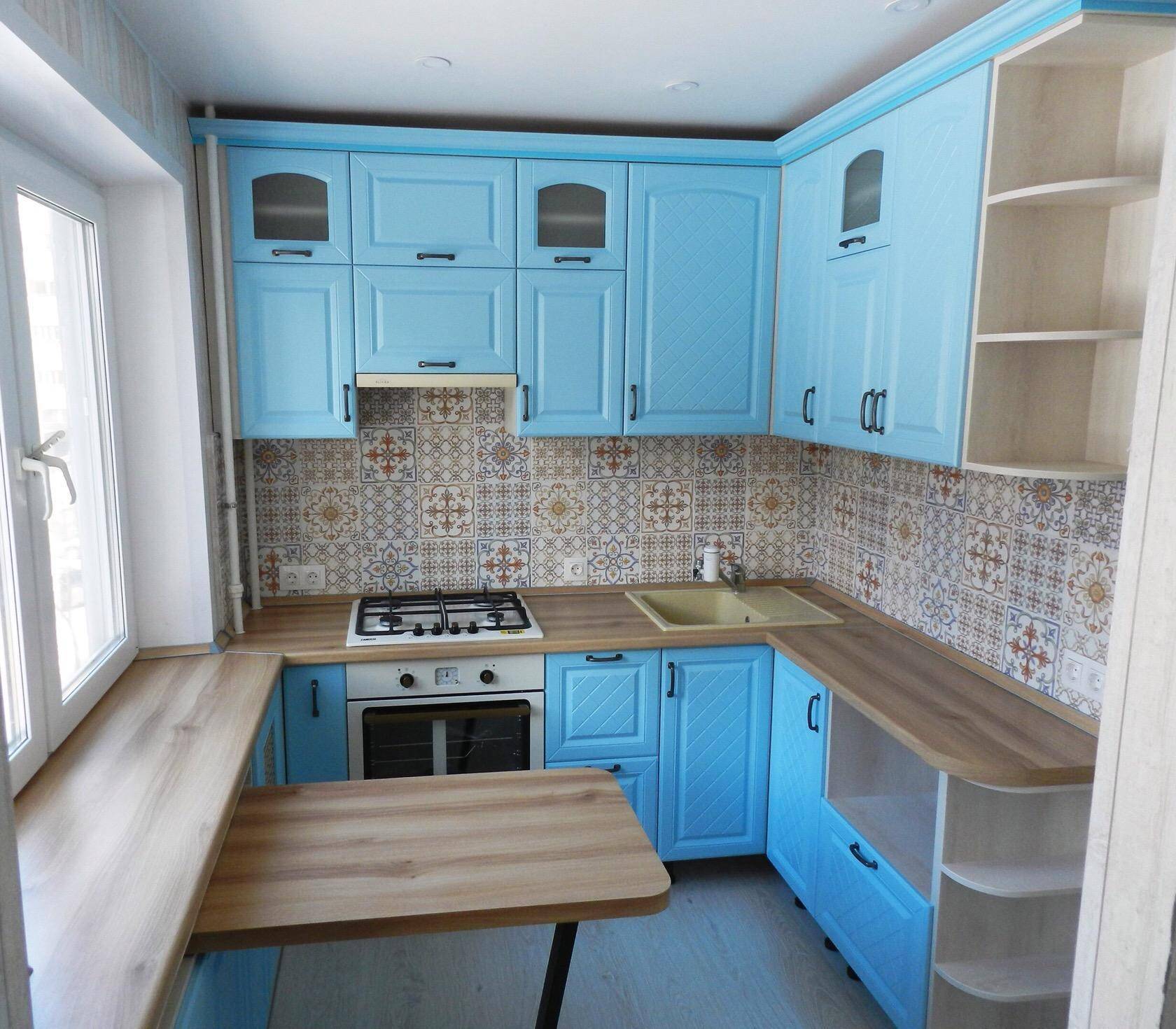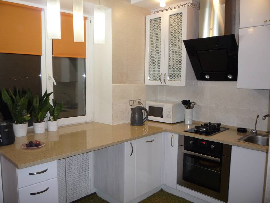 Впрочем, иногда можно обойтись без радикальных мер и просто выстроить гарнитур вдоль окна, укрепив при этом его заднюю стенку и … смирившись с ограничением угла раскрытия створок. В итоге между напольными тумбами и окном получится ниша, которую можно приспособить для хранения цветочных горшков или кухонных мелочей. Ниже на фото вы можете увидеть пример кухни в хрущевке с такой дизайн-хитростью.