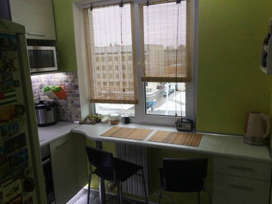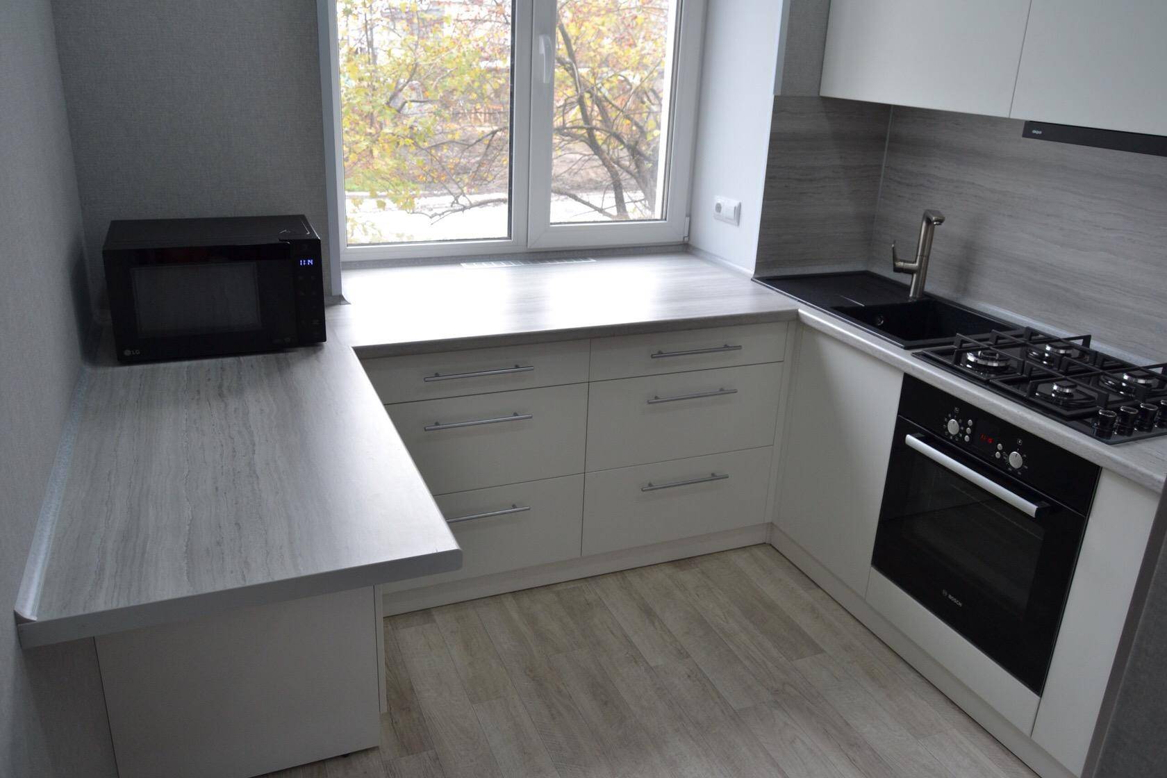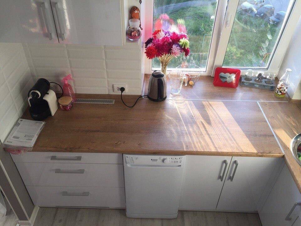 Для маленькой кухни с окном, можно установить столешницу вместо подоконника, таким образом вы сэкономите место.