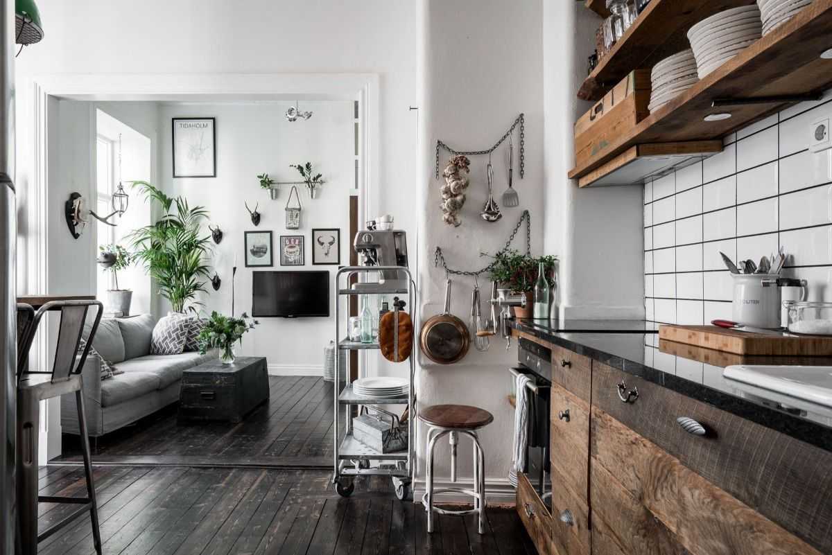 Если нужно оформить маленькую кухню с островом, скандинавский стиль поможет сделать обстановку визуально легкой, объемной. Для кухонного гарнитура предпочтителен белый цвет, столешница изготавливается из светлых пород дерева. Островная конструкция на колесиках может перемещаться и использоваться при необходимости как дополнительная рабочая зона. Внутренняя часть стационарного острова часто используется под хранение, в скандинавском стиле органично смотрятся открытые полки с разнообразной кухонной утварью. Если кухня небольшая, применяют двухуровневые островные столешницы, организуют барную стойку в качестве обеденной зоны.