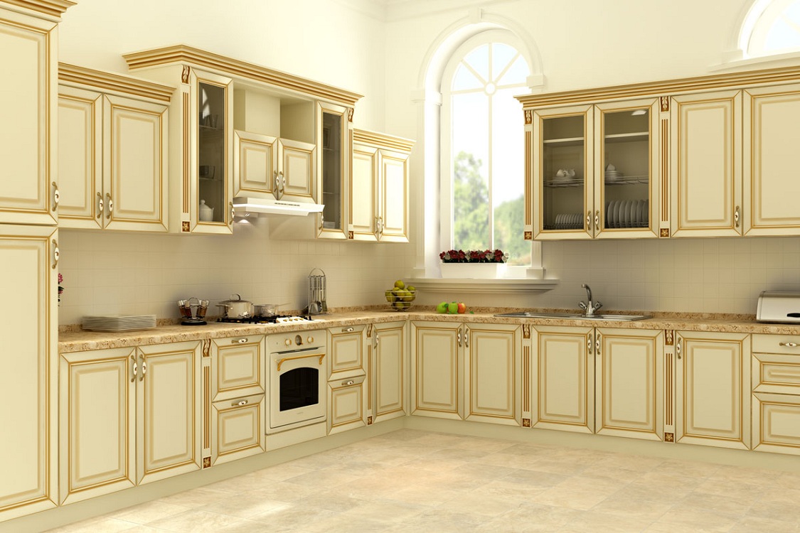 - Золото. Кухня с патиной под золото, с фасадами, украшенными подобным составом, отлично подойдет для классической кухни. Золотая патина смотрится очень красиво и закрепляется только матовым лаком, так как глянец может испортить эффект.
