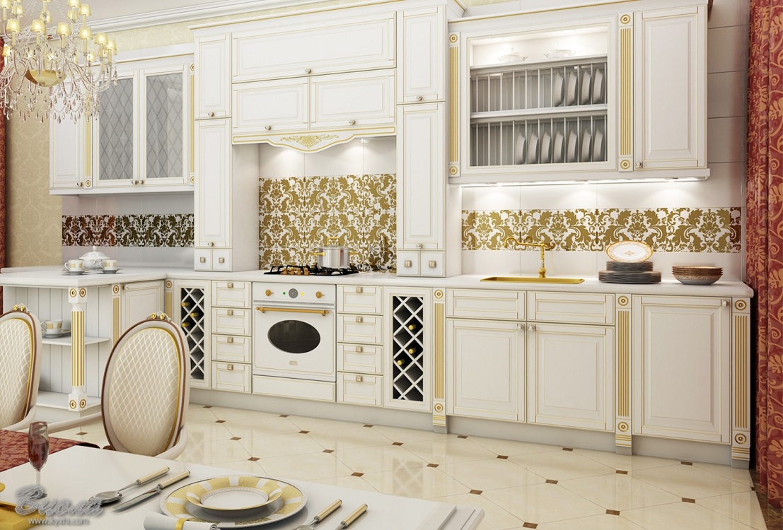 Лучше всего кухня в классическом стиле сочетается с патиной нейтральных тонов – серой, зеленоватой, бронзовой. Золотая и серебряная патина – самый роскошный вариант, однако, этими цветами не следует злоупотреблять. Такая мебель будет выглядеть безвкусно на кухне, которая изобилует дополнительным декором: картинами в резных рамках, свечами, статуэтками, посудой с росписью, узорными обоями и т. д.