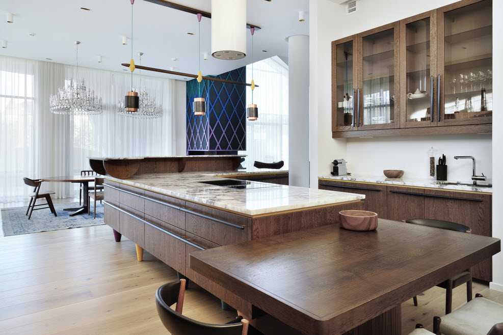 Роскошная дизайнерская кухня-гостиная-столовая в частном доме