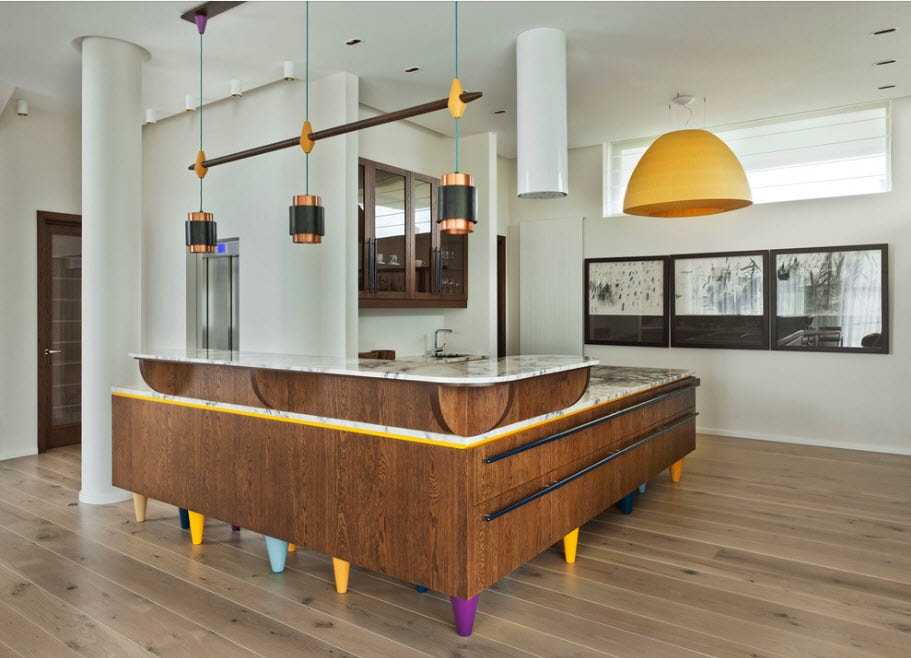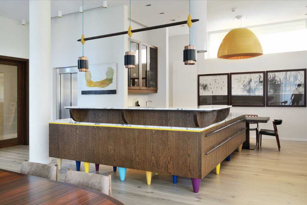 Яркие акценты – неотъемлемая часть интерьера. На общем бежевом фоне встречаются выразительные детали, такие как различные по цвету ножки центрального острова, стильные абажуры и даже графические объекты.