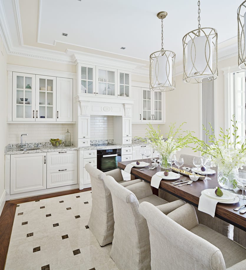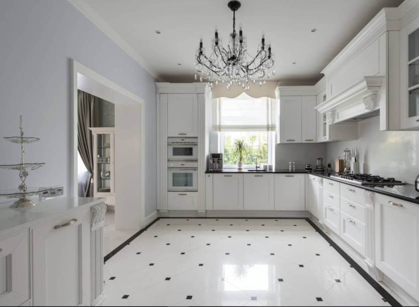 Плитка под мрамор или гранит светлых тонов или линолеум аналогичного цвета хорошо будет смотреться в качестве материала для отделки пола белой кухни в 2022 году.