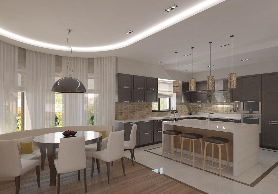 Кухня, переходящая в гостиную, может иметь различные формы, в зависимости от планировки дома или квартиры. Площадь функционально делится на 3 части, столовая может размещаться в гостевой зоне или становится частью кухонного пространства.