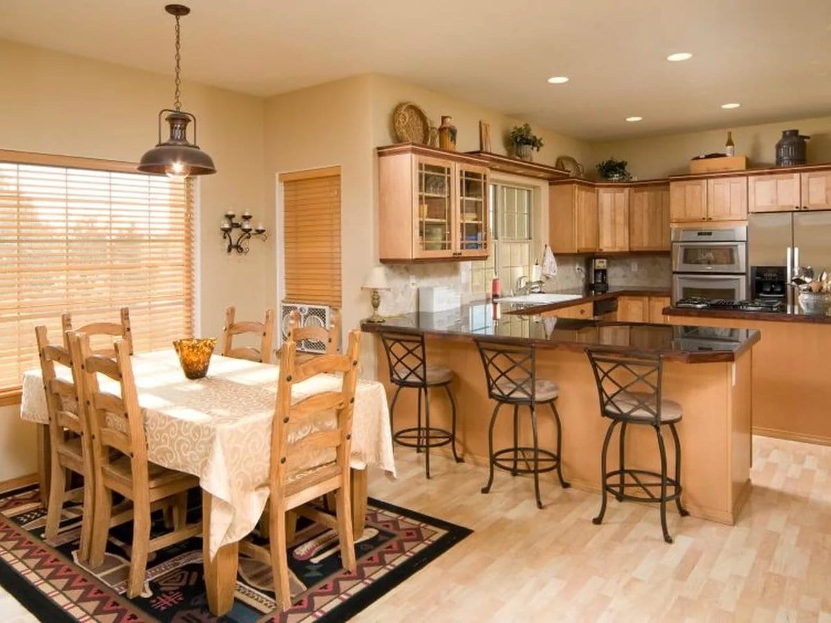 Совмещенные помещение. Как показывают фото дизайна кухни в частном доме здесь прекрасно размещается столовая, нередко встречается и кухня-гостиная в частном доме. В этом случае элементами зонирования могут служить обеденный стол, барная стойка, диван, невысокие гипсокартонные перегородки. Отделить два помещения можно также с помощью разных уровней потолка или пола, фактуры или цвета отделочных материалов.