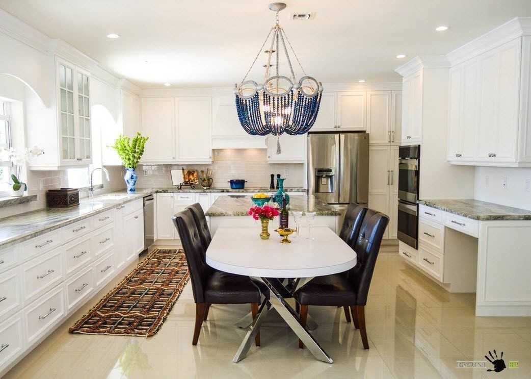 Классическая обстановка кухни с белоснежными традиционными фасадами кухонных шкафов и каменными столешницами становится современной, приобретает оттенок стиля модерн, если установить к кухонному острову оригинальную обеденную группу, состоящую из белоснежного стола на зеркальных ножках и темных кресел-стульев с кожаной обивкой. Добавьте к обстановке необычную люстру с декором из синего стекла и получите оригинальный и запоминающийся образ кухни-столовой.