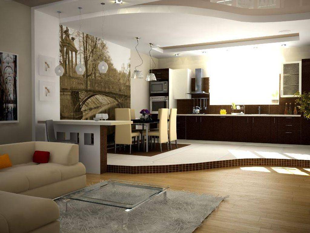 Потолка. Потолки в гостиной можно украсить декоративными деревянными балками, в то время как в кухне оставить однотонное покрытие. Подобное сочетание прекрасно смотрится в интерьере в стиле кантри или модерн.