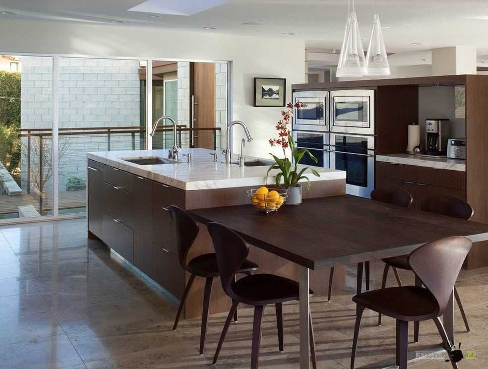 - Обеденный стол. Поскольку в некоторые кухни совмещенные с гостиной барная стойка не вписывается стилистически, ее можно заменить большим обеденным столом. Так мы получим кухню, полностью соответствующую западным традициям – ведь в Европе и США принято обедать именно на кухне.