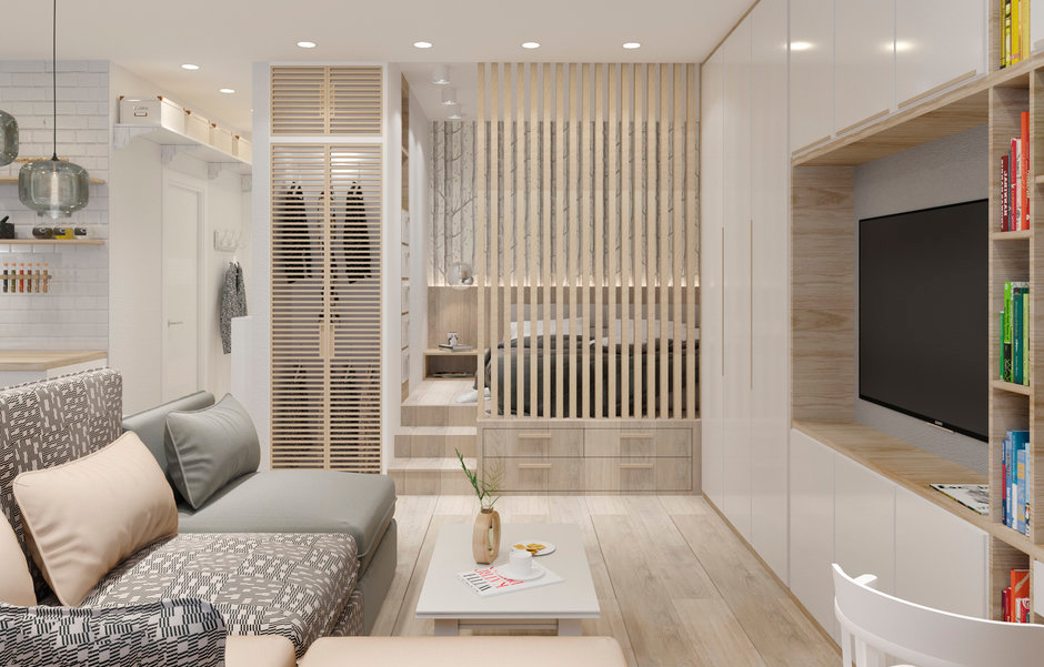 Кухню-спальню, независимо от ее площади обязательно стоит зонировать. Хотя бы минимально отделить спальное место от остальной части помещения.