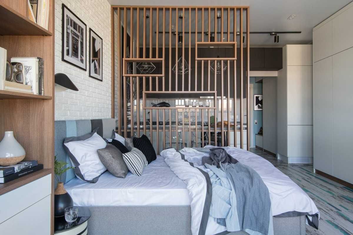 Совмещение спальни и кухни — достаточно необычная практика в создании интерьера. Однако именно такое решение порой оказывается наиболее удачным. Дизайнеры студии «Мой дом» сумели создать невероятный дизайн помещения в современном стиле.