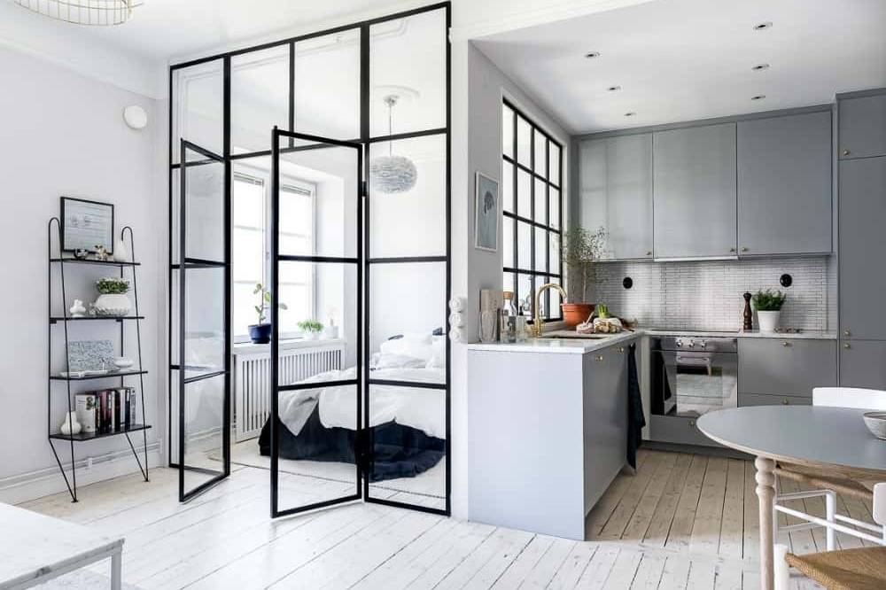 Раздвижные двери. Они вариант, позволяющий полностью изолировать выбранную зону. При этом двери не занимают много места. Они могут быть полностью прозрачными или не пропускающими свет. Удобно, что такие двери сдвигаются по необходимости.