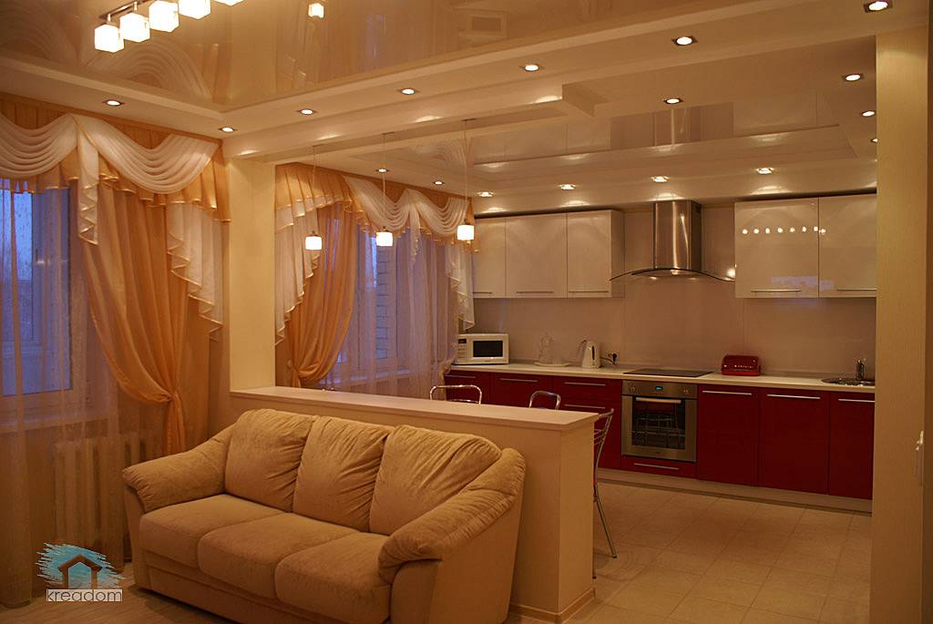 - Проект кухни-спальной воплотить в жизнь сложно. Нужно получить большое количество самых разрешений на снос стен.