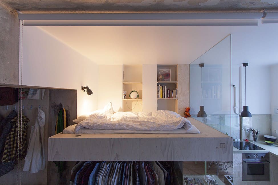 С его помощью можно выделить одну из зон в комнате. Лучше всего – спальную. К такому решению стоит прибегать, если в помещении достаточно высокие потолки. Большой подиум позволяет еще и сделать внутри него ящики для хранения мелочей. Если диван ставится у входа, то далее к зоне готовки в дальнем углу может быть подъем по ступенчатому подиуму.