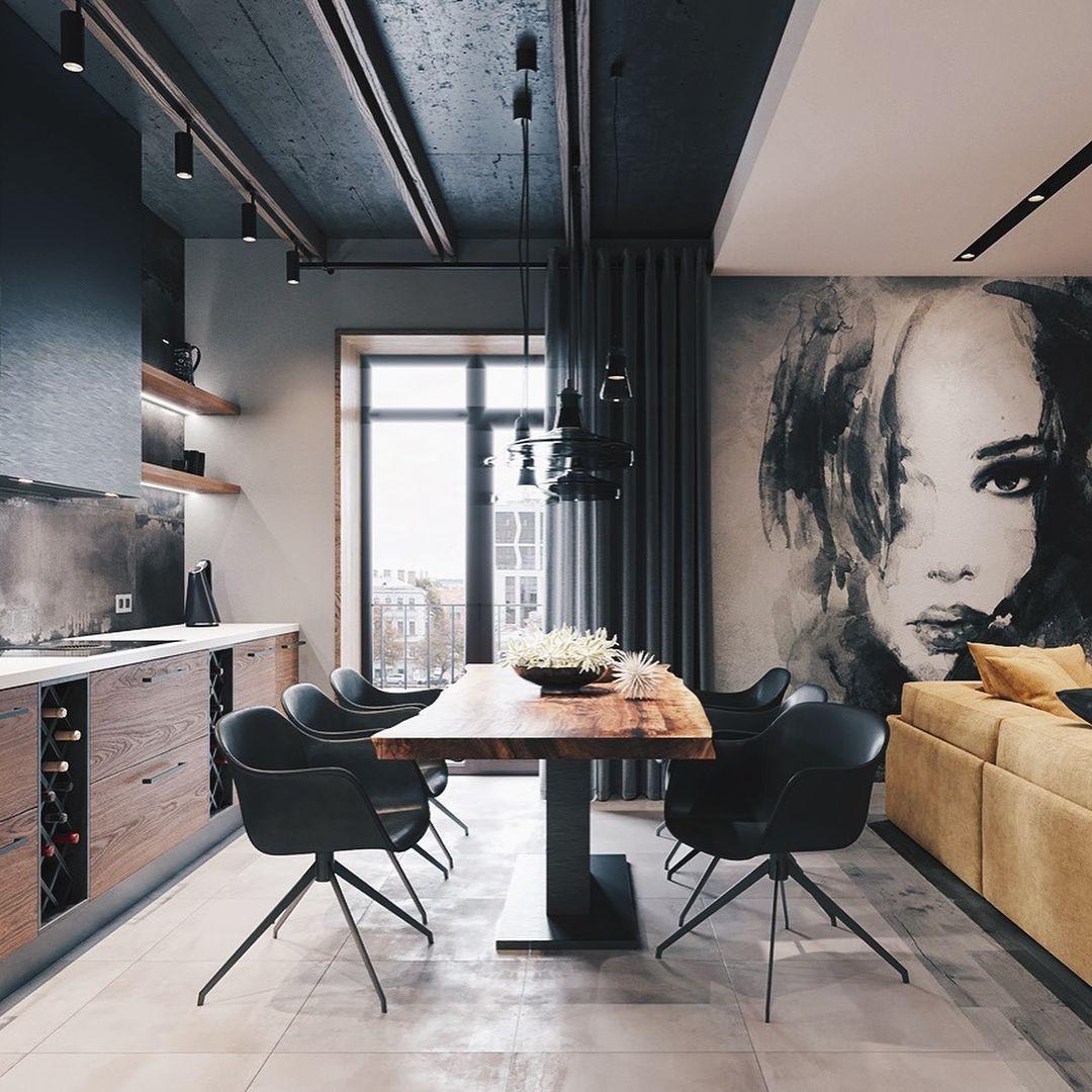 Интерьер столовой-гостиной с элементами лофта в дизайне