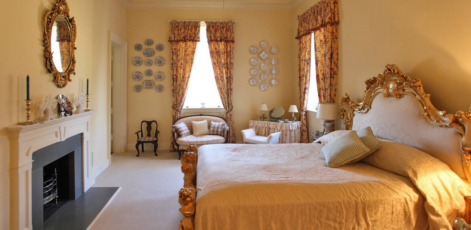 В спальнях может сочетаться классика и кантри. Здесь присутствует внушительная габаритная мебель, светлые пастельные тона и уютный текстиль. Для спального места характерно наличие высокого изголовья и банкетки со стороны ног. С двух сторон от изголовья размещаются две прикроватные тумбочки, оснащенные выдвижными ящичками и светильниками – настольными или бра. Для размещения постельного белья и одежды стоит предусмотреть комод, а если пространство позволяет – вместительный шкаф-купе или гардеробную. В современные интерьеры органично вписываются плетеные кресла и кровати из металла.