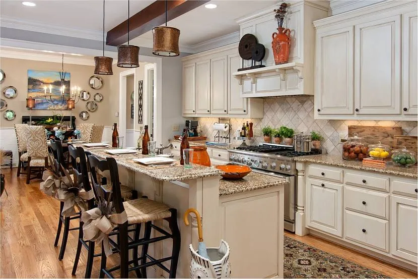 В традиционной американской кухне предметы мебельного гарнитура расставляются по периметру; в центре ставят остров, реже обеденный стол в окружении стульев. Планировка имеет П-образную или Г-образную форму; она практична, и позволяет организовать комфортную рабочую зону.