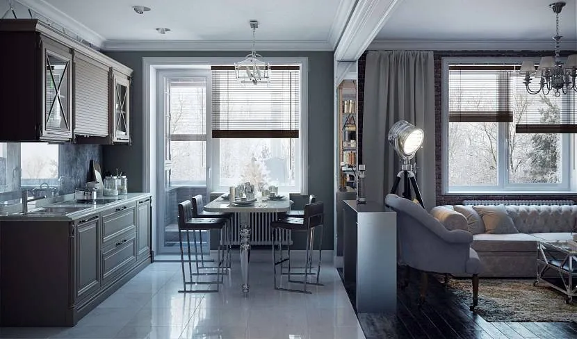 Фотоотчет о стильной и минималистичной кухне в разных оттенках серого. Рабочая и столовая зона, выход на балкон.