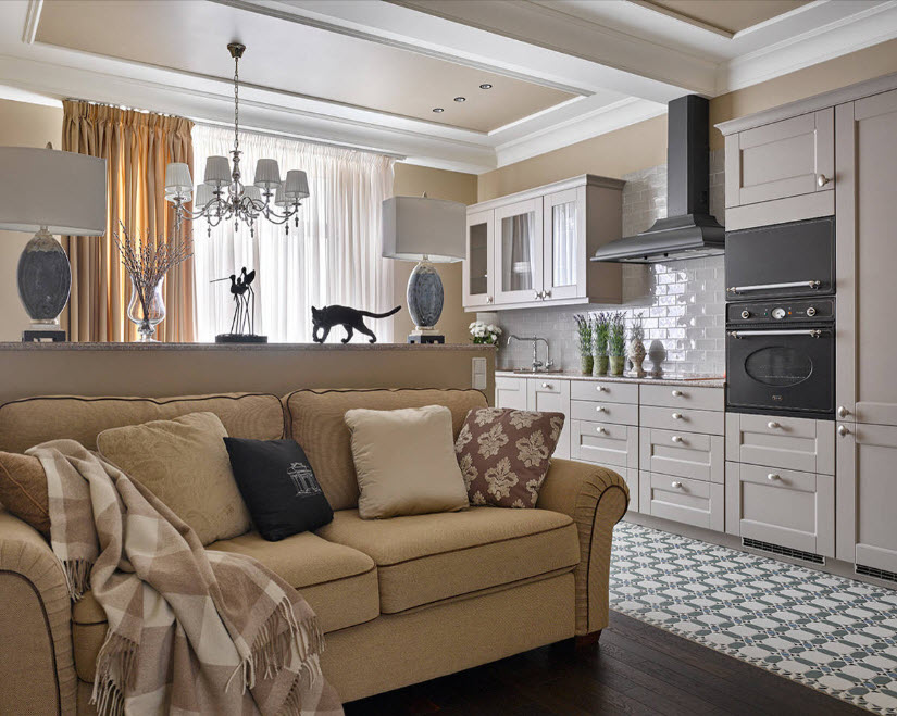 Разделение на зоны должно выполнять практическую функцию, позволяя жильцам комфортно чувствовать себя и на кухне, и в гостиной, занимаясь домашними делами или отдыхая. Но для создания красивых интерьеров нужно учитывать стилистическую и цветовую согласованность разных зон. Мебель для кухни и для гостиной лучше подбирать в общей цветовой гамме или в сочетаемых между собой оттенках.