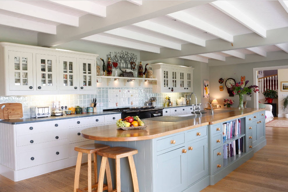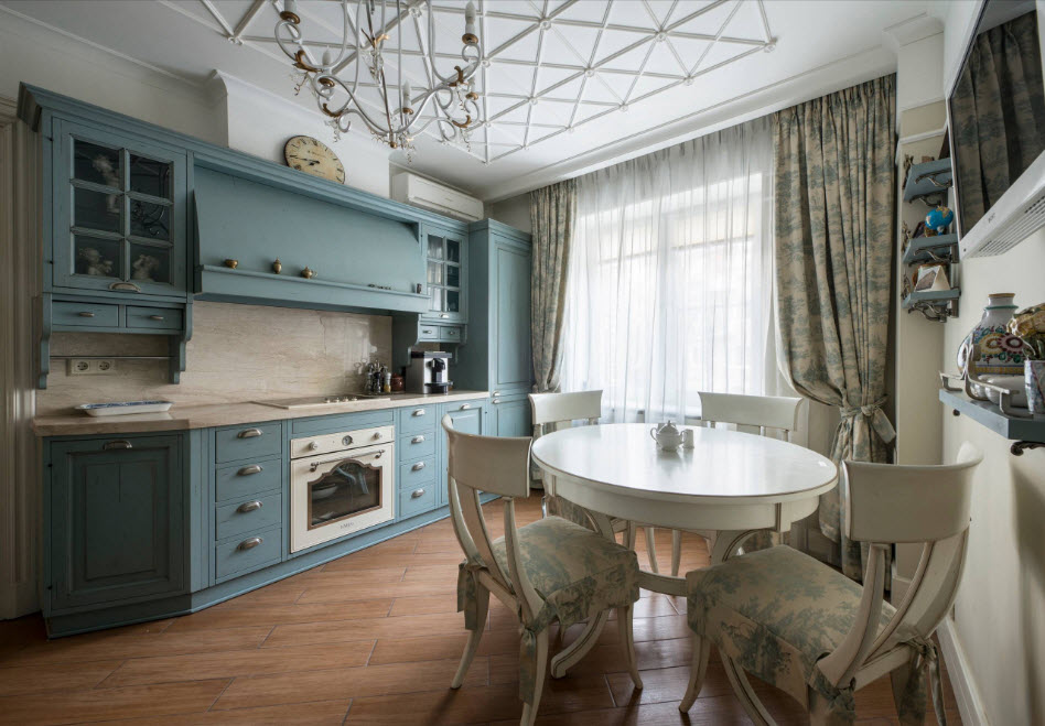 Занавески легкие, скатерти кружевные. Преобладают натуральные ткани: лен, хлопок. Фартук выложен плиткой с растительным орнаментом. Верхние ящики гарнитура заменены полками. Резная деревянная мебель состарена. Преобладают светлые оттенки: бежевый, лавандовый, бирюзовый, белый, голубой. Посуда простая, без изысков, с цветочным принтом. Декор дополняют вазы с цветами, стоящие на тумбочках и этажерках. Стены и потолок кухни красятся в белый цвет. Белая кухня прекрасно оттеняет балки на потолке.