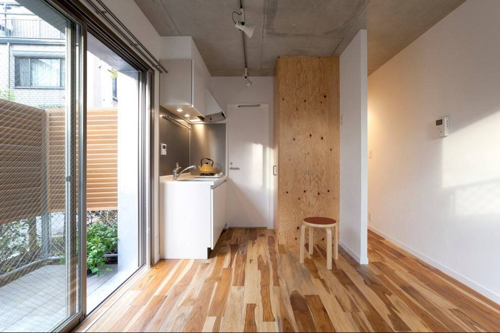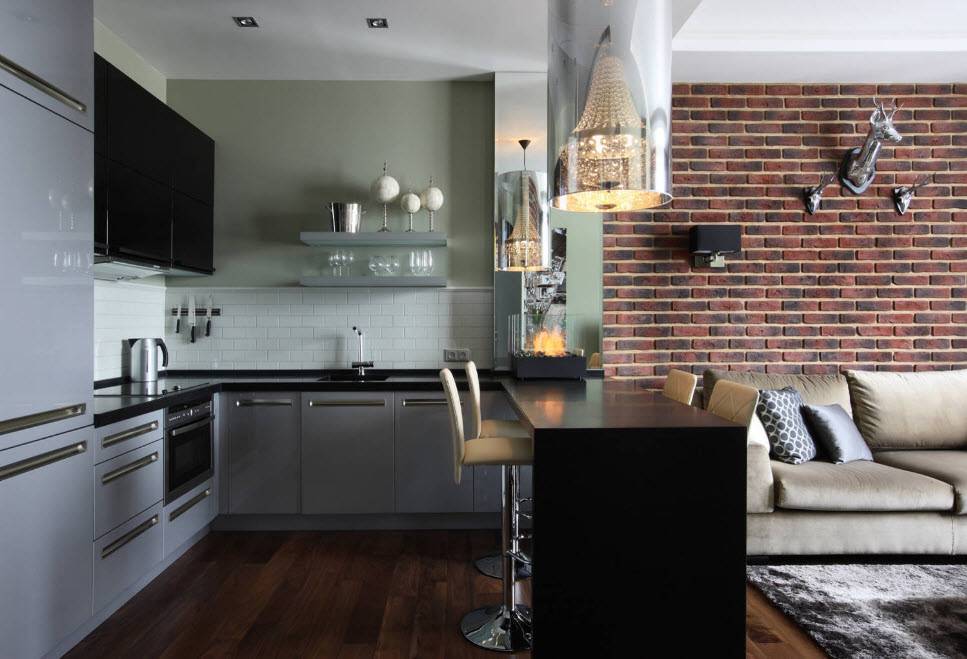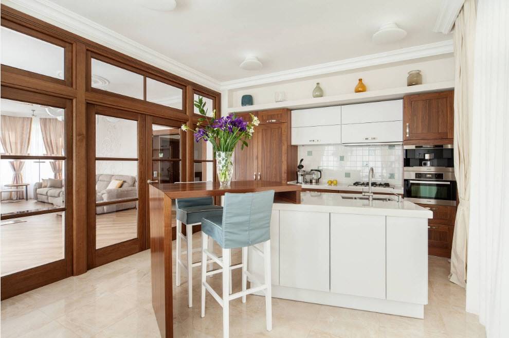 В этом случае следует задуматься, чтобы разделить пространство на две зоны – принятия пищи и непосредственно готовки.