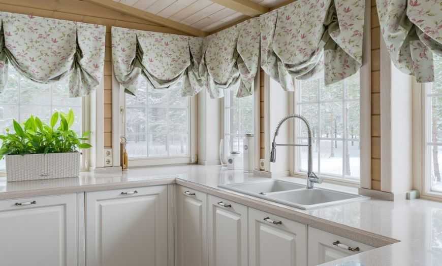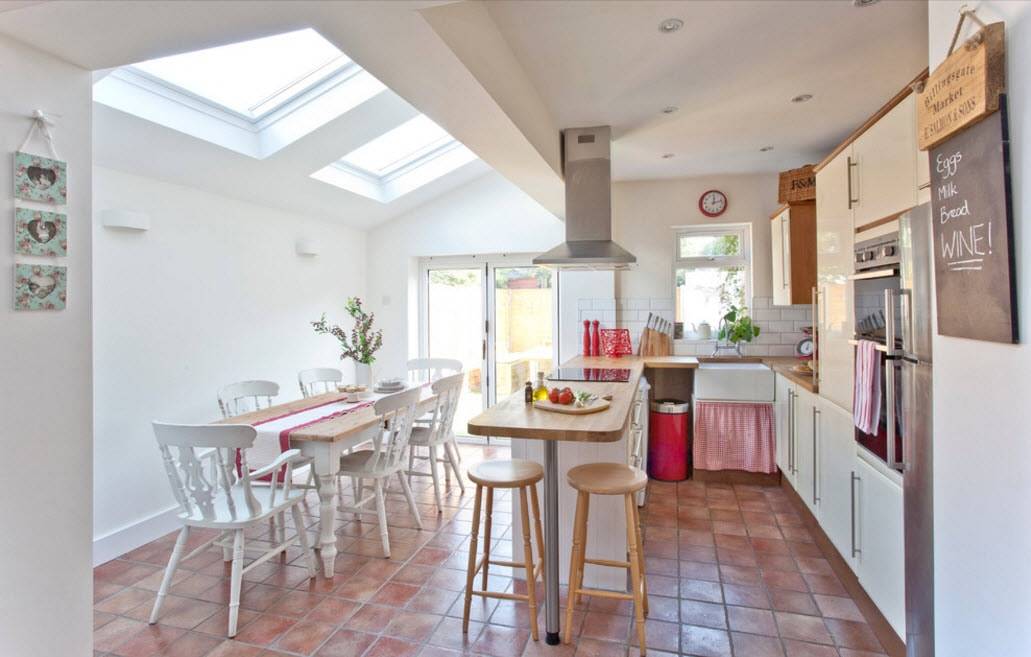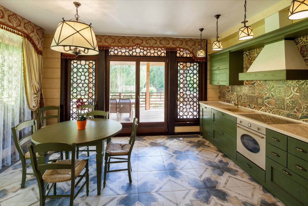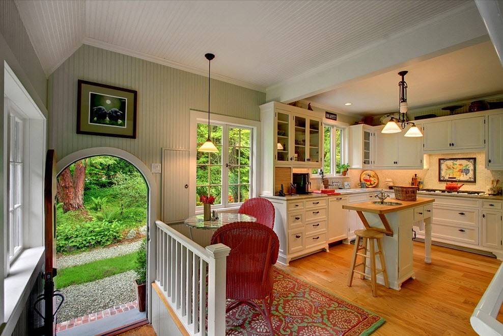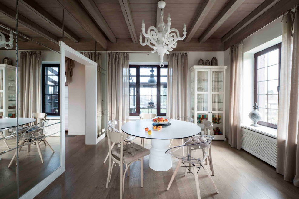 В дневное время естественный свет проникает в дом благодаря панорамному остеклению. Визуально расширить пространство помогает белая побелка стен и потолка. Они могут быть и других цветов: фисташковым, мятным, светло-голубым. Фартук природных оттенков: зеленый, коричневый, синий. Материалы натуральные, высокого качества.