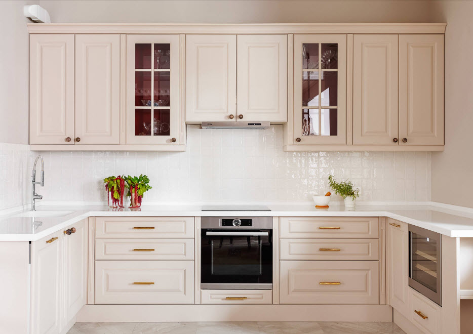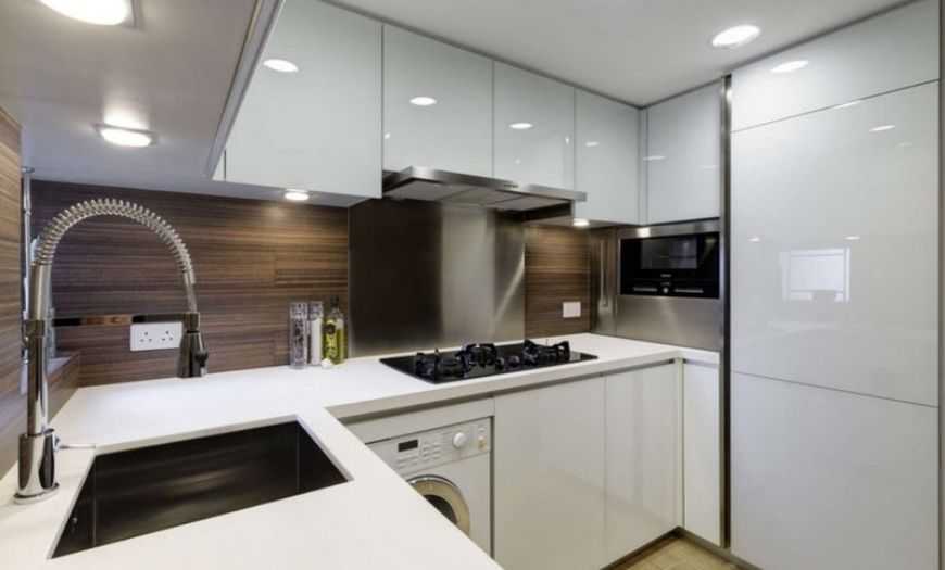 - Минимализм. Несмотря на отсутствие декора и кажущуюся холодность, это направление идеально для современного интерьера. Главное требование — никаких деталей на виду. Для этого закажите гарнитур с двумя-тремя рядами закрытых шкафчиков.