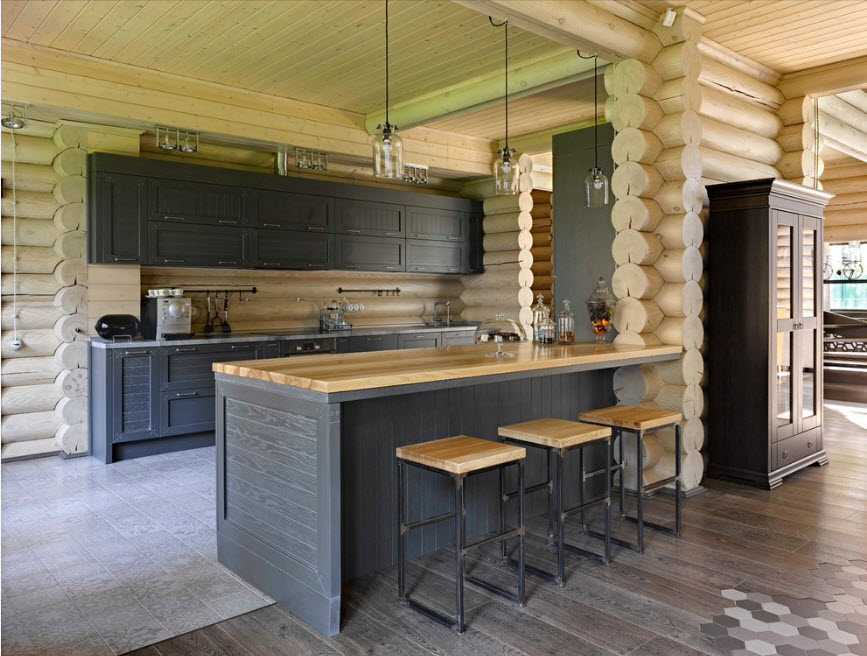 - Как бы удивительно это ни звучало, но барная стойка будет отлично смотреться на кухне в деревянном доме. Причем изготовить ее можно собственными рукамииз стройматериалов, которые остались после ремонта. Это могут быть балки, доски, бруски, ровный спил и так далее. Получится шикарно, если подобными элементами украсить подоконник или лестницу — это создаст особую атмосферу помещения.